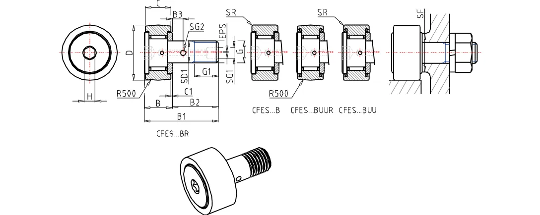 Eccentric Stud Metric Cam Follower, Caged, High Carbon Steel, Crowned Outer Ring, Sealed, Hex Head,